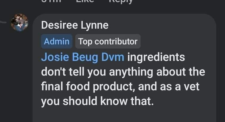 She attempted to shame me as a veterinarian by regurgitating propaganda from our friend, Dr. Lisa Freeman, the one who started the fake news about grain-free diets causing heart disease in dogs. It appears that she wrote an article claiming the ingredients on a label of dog food tell one nothing about the final product so just tell people not to bother reading the label.